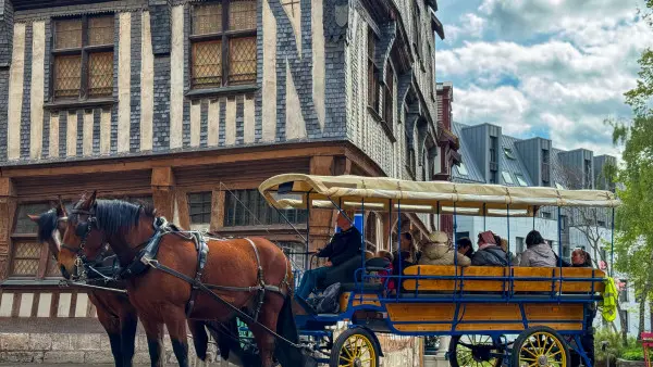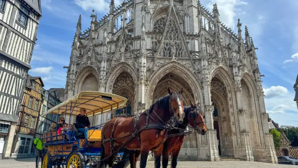 Explications patrimoniales et historiques sur les différents monuments qui se trouvent sur le trajet : abbatiale Saint-Ouen, jardins de l’abbatiale, hôtel de ville, les maisons à colombages de la rue des faux, le marché de la place Saint-Marc, église Saint-Maclou, les antiquaires de la rue Damiette et les teinturiers de la rue Eau de Robec
